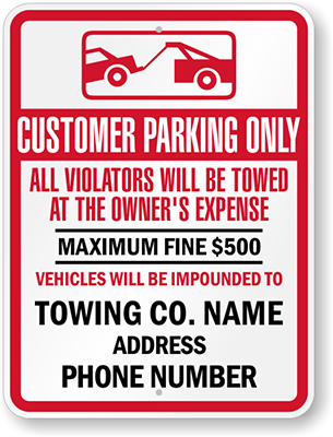 Custom Tow Away Sign: Customer Parking Only, All Violators Will Be Towed At The Owner's Expense, Maximum Fine $500, Vehicles Will Be Impounded To Towing Co. Name Address, Phone Number (with Graphic)