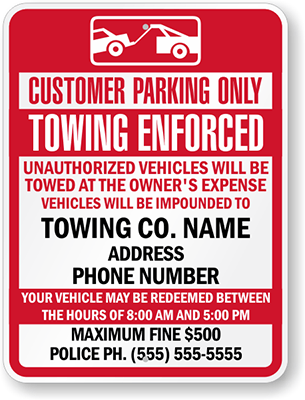 Custom Tow Away Sign: Customer Parking Only, Towing Enforced, Unauthorized Vehicles Will Be Towed At The Owner's Expense, Vehicles Will Be Impounded To, Towing Co. Name Address Phone Number, Your...
