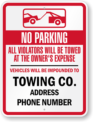 Custom Tow Away Sign: No Parking, All Violators Will Be Towed At Owner's Expense, Vehicles Will Be Impounded To, Towing Co. Address Phone Number (with Graphic)
