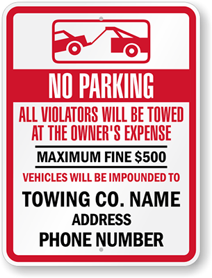 Custom Tow Away Sign: No Parking, All Violators Will Be Towed At The Owner's Expense, Maximum Fine $500, Vehicles Will Be Impounded To Towing Co. Name Address, Phone Number (with Graphic)