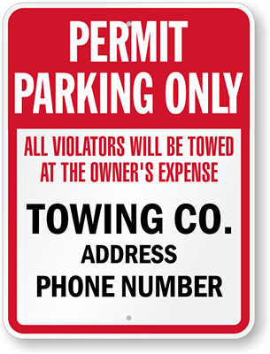 Custom Tow Away Sign: Permit Parking Only, All Violators Will Be Towed At The Owner's Expense, Towing Co. Name Address, Phone Number