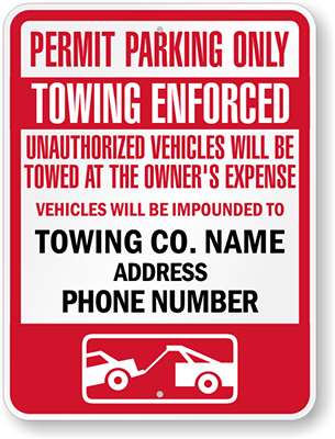 Custom Tow Away Sign: Permit Parking Only, Towing Enforced, Violators Will Be Towed At The Owner's Expense, Vehicles Will Be Impounded To - Add Own Towing Co. Name Address Phone Number (with Graphic)