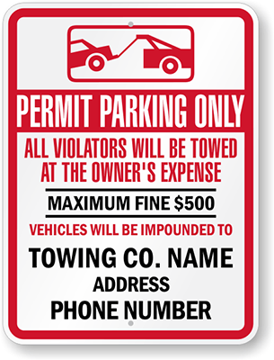 Custom Tow Away Sign: Permit Parking Only, All Violators Will Be Towed At The Owner's Expense, Maximum Fine $500, Vehicles Will Be Impounded To Towing Co. Name Address, Phone Number (with Graphic)