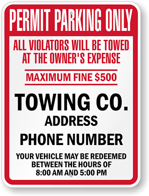 Custom Tow Away Sign: Permit Parking Only, All Violators Will be Towed At The Owner's Expense, maximum Fine $500, Towing Co. Address Phone Number, Your Vehicles May BE Redeemed Between The Hours Of...
