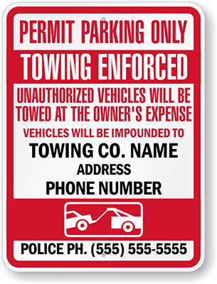 Custom Tow Away Sign: Permit Parking, Towing Enforced, Unauthorized Vehicles Will Be Towed At The Owner's Expense, Vehicles Will Be Impounded To, Towing Co, Address Phone Number (with Graphic),...