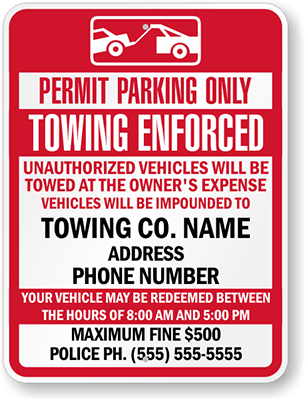 Custom Tow Away Sign: Permit Parking Only, Towing Enforced, Unauthorized Vehicles Will Be Towed At The Owner's Expense, Vehicles Will Be Impounded To, Towing Co. Name Address Phone Number, Your...
