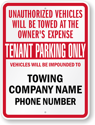 Custom Tow Away Sign: Unauthorized Vehicles Will Be Towed At The Owner's Expense, Tenant Parking Only, Vehicles Will Be Impounded To, Towing Company Name, Phone Number