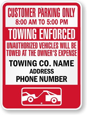 Custom Tow Away Sign: Customer Parking Only, 8:00AM To 5:00 PM Towing Enforced, Unauthorized Vehicles Will Be Towed At The Owner's Expense, Towing Co. Name Address Phone Number (with Graphic)