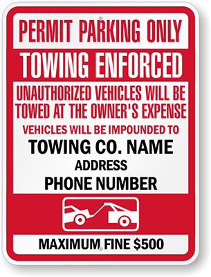 Custom Tow Away Sign: Permit Parking, Towing Enforced, Unauthorized Vehicles Will Be Towed At The Owner's Expense, Vehicles Will Be Impounded To, Towing Co, Address Phone Number (with Graphic),...