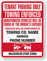 Custom Tow Away Sign: Tenant Parking, Towing Enforced, Unauthorized Vehicles Will Be Towed At The Owner's Expense, Vehicles Will Be Impounded To, Towing Co, Address Phone Number (with Graphic),...