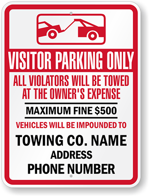Custom Tow Away Sign: Visitor Parking Only, All Violators Will Be Towed At The Owner's Expense, Maximum Fine $500, Vehicles Will Be Impounded To Towing Co. Name Address, Phone Number (with Graphic)