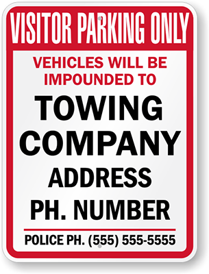 Custom Tow Away Sign: Visitor Parking Only, Vehicles Will Be Impounded To Towing Company Address Ph. Number, Police Ph.(555) 555-5555