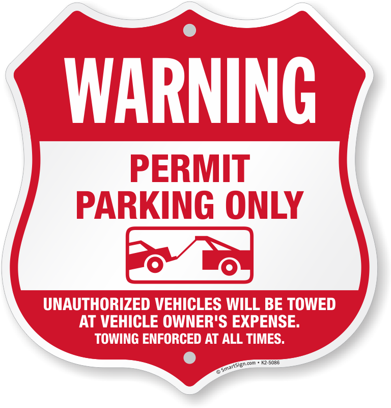 No Parking Without Permit Shield Sign: Warning - Permit Parking Only, Unauthorized Vehicles Will Be Towed At Vehicle Owners Expense, Towing Enforced Learn More...