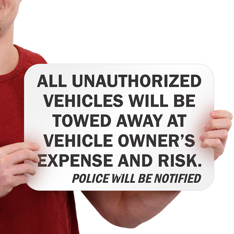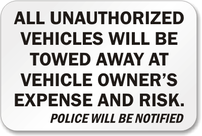 Tow Away Sign: All Unauthorized Vehicles Will Be Towed Away At Vehicle Owner's Expense And Risk. Police Will Be Notified K-1365 Learn More...
