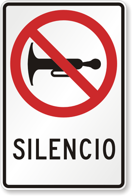 This red and black, Spanish No Honking sign tells drivers not to beep their horn. The pictogram and text work together, conveying a clear message to a diverse speaking population.