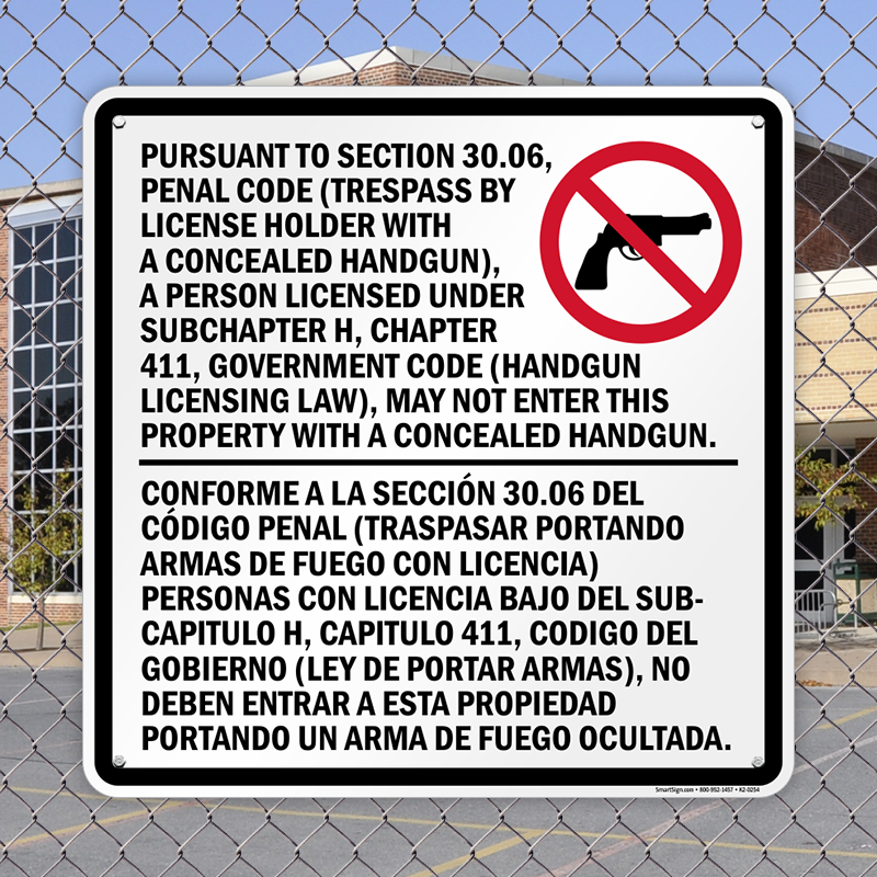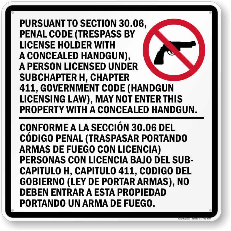 This Texas gun law sign for prohibiting firearms on your property in accordance with section 30.06 of the Texas Penal Code has the official message in English and Spanish in a 1" font.