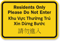 Multilingual Residents Only Sign: Please Do Not Enter (Chinese/Vietnamese/English) K-9290 Learn More...