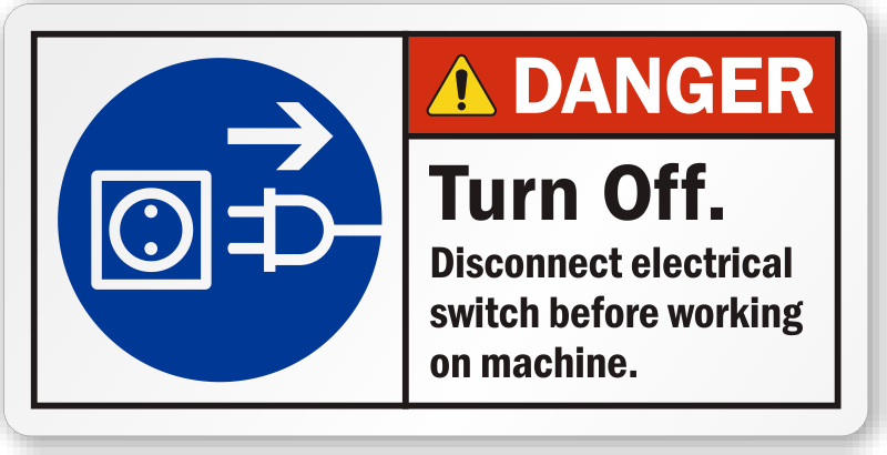 Electricity can injure personnel working on an otherwise idle machine. Use this ANSI Warning Label to instruct workers to turn off and disconnect the electrical switch before working on a machine.