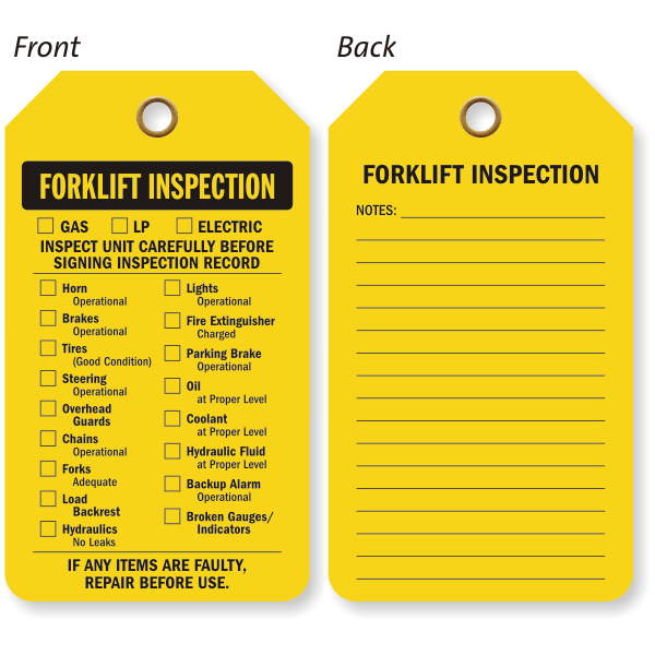 Regular inspection means better protection against preventable accidents. Maintain your forklift inspection record with this bright, Two-Sided Forklift Status Tag.