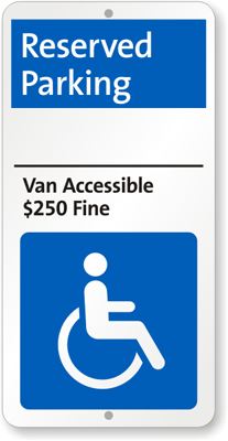 Properly disclose that illegitimate parking in van accessible handicapped parking areas is not tolerated. This new-look parking sign dictates that violators are subject to a $250 fine.