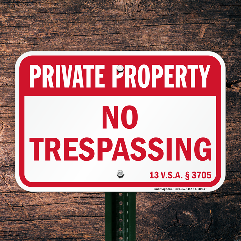 Vermont Private Property Sign: No Trespassing, 13 VSA § 3705 K-1125-VT Learn More...