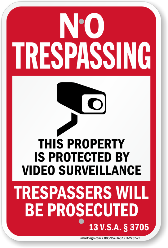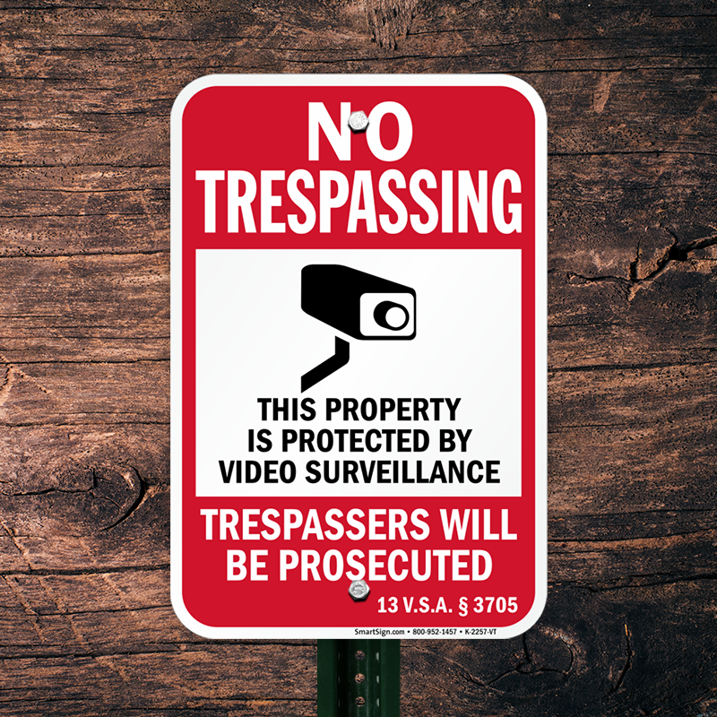 Vermont No Trespassing Sign: This Property Is Protected By Video Surveillance, Trespassers Will Be Prosecuted – 13 VSA § 3705 K-2257-VT Learn More...