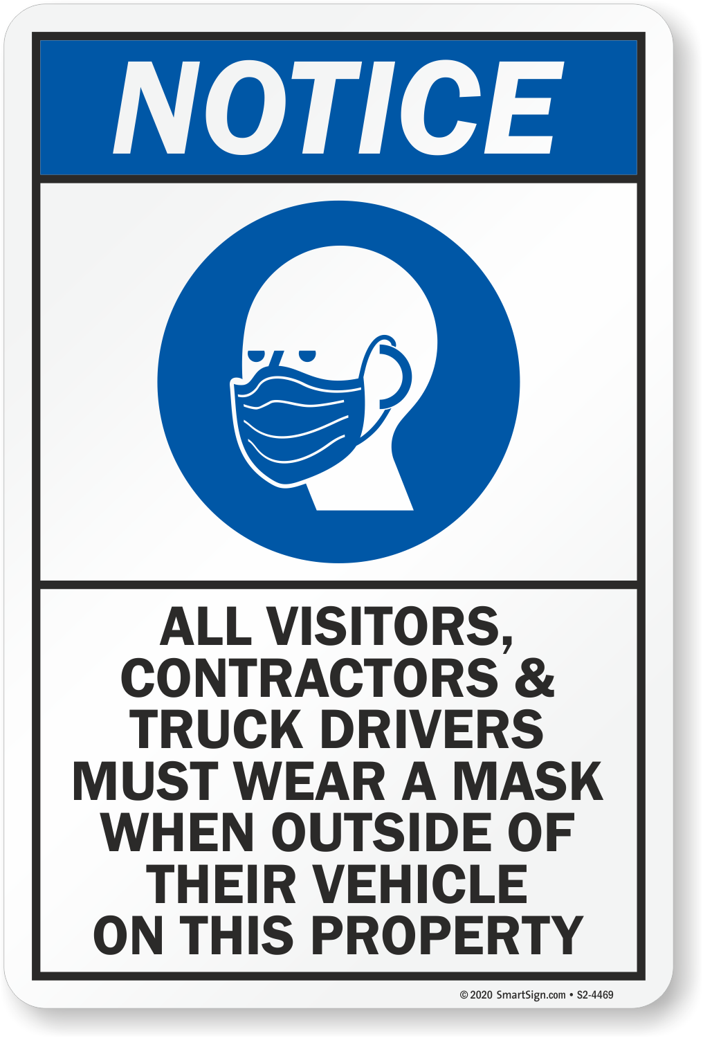 ANSI Notice Sign: Notice - All Visitors, Contractors & Truck Drivers Must Wear A Mask When Outside Of Their Vehicle On This Property