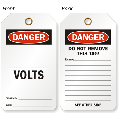 - Tag informs employees of the exact voltage of a machine or equipment.