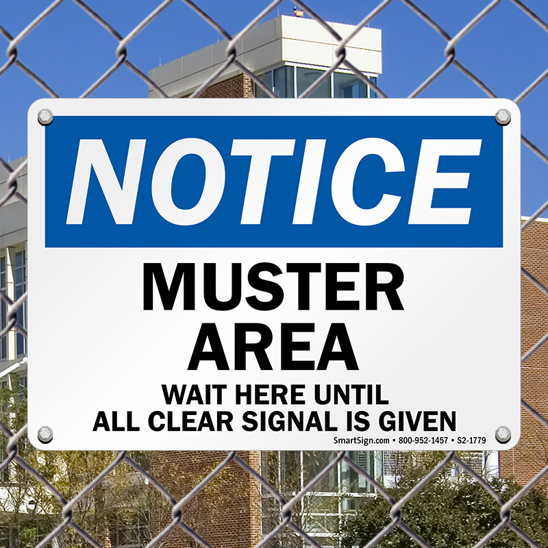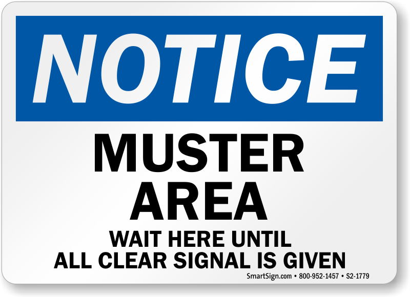 OSHA Notice Sign: Notice - Muster Area Wait Here Until All Clear Signal Is Given S2-1779