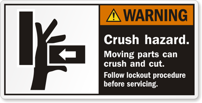 Warning Safety Label: Crush Hazard, Moving Parts Can Crush And Cut, Follow Lockout Procedure Before Servicing, LB-0144 Learn More...