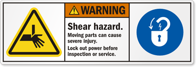 ANSI Warning Safety Label: Shear Hazard - Moving Parts Can Cause Severe Injury Lock Out Power Before Inspection Or Service LB-0186 Learn More...