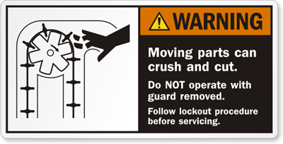 Hand Cut ANSI Warning Label: Moving Parts Can Crush And Cut, Do Not Operate With Guard Removed, Follow Lockout Procedure Before Servicing LB-0220 Learn More...