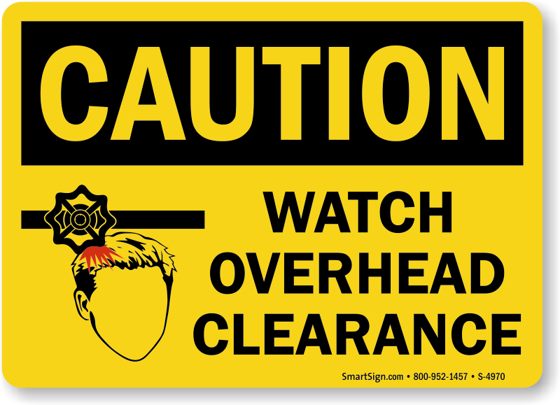 Ensure that people watch out for overhead clearance in your facility. Avoid accidents and warn everyone with this OSHA caution sign with graphic.
