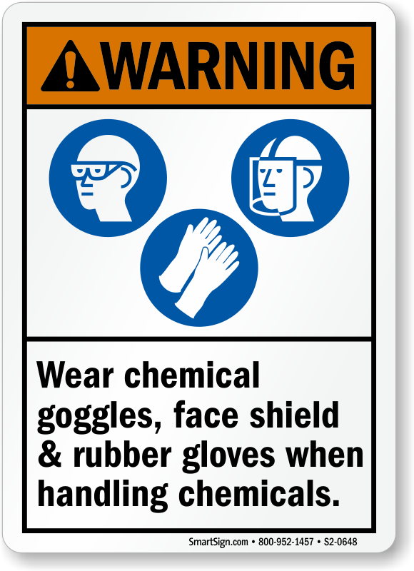 ANSI Warning Sign: Wear Chemical Goggles, Face Shield & Rubber Gloves When Handling Chemicals (With PPE Symbols)