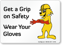 Tell workers and visitors to wear gloves in a humorous tone. This 'Get a Grip on Safety - Wear Your Gloves' sign is fun.