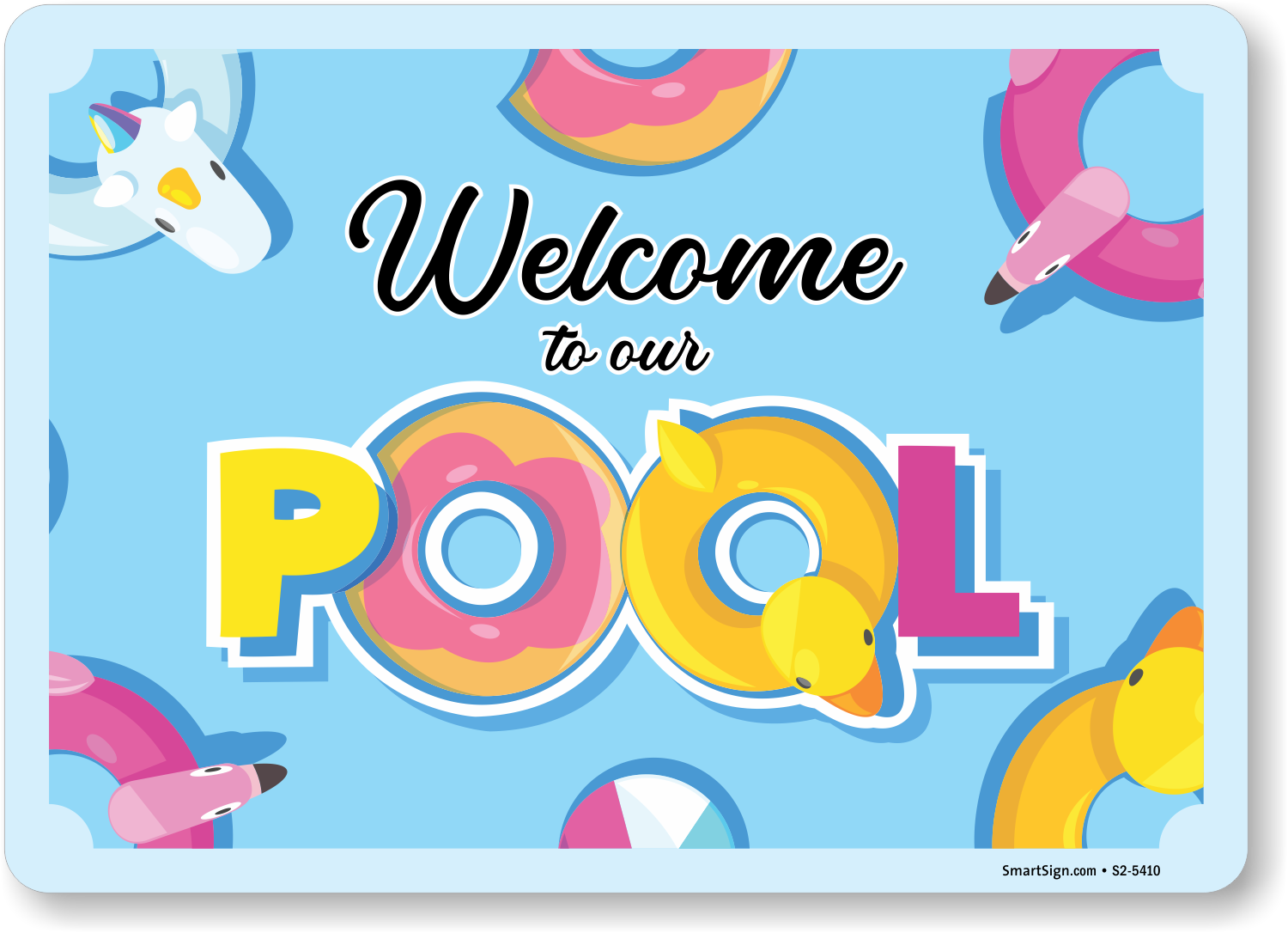 Bright and colorful "Welcome To Our Pool" sign leaves a great impression on your guests.
