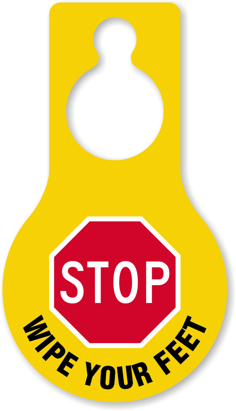 Pear Shaped Plastic Door Hang Tag: Wipe Your Feet (with Stop Symbol) TG-1416