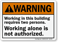 ANSI Warning Sign: Working In This Building Requires Two Persons. Working Alone Is Not Authorized. S2-0176