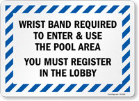 Control access to your pool with a Wrist Band Required Sign like this.
