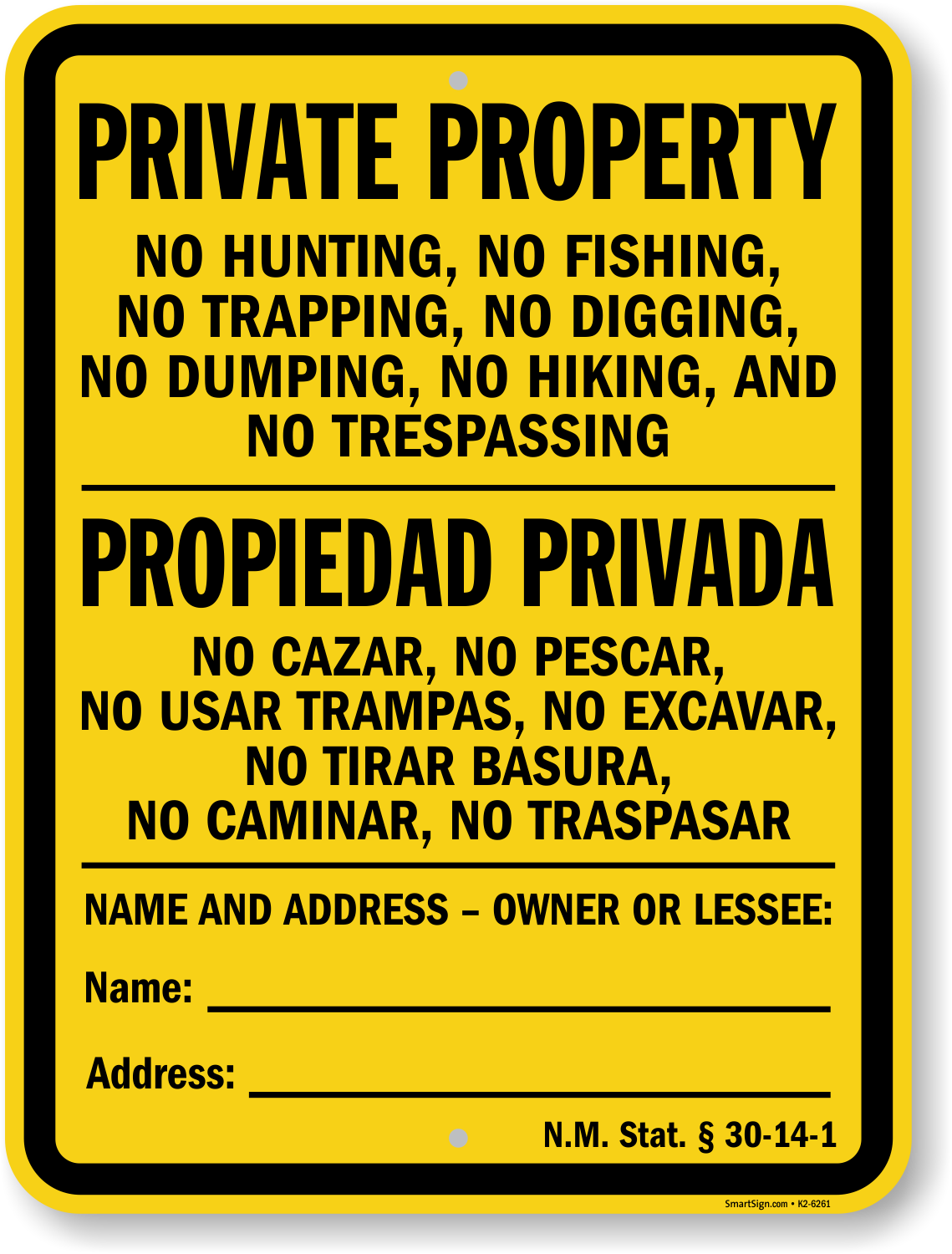 Official Bilingual New Mexico Private Property Write-On Sign: No Hunting, No Fishing, No Trapping, No Digging, No Dumping, No Hiking, And No Trespassing - Write Your Name and Address - N.M. Stat. §... K2-6261
