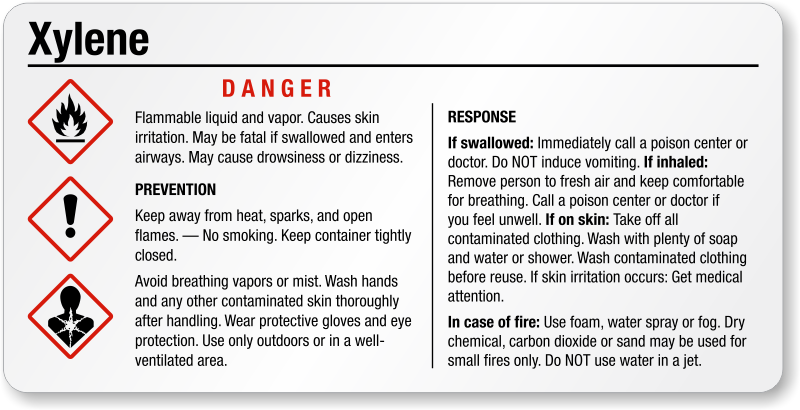 Display Xylene's properties, hazards, prevention, response during emergency, storage, and disposal details with this small GHS Chemical Label. Safeguard your employees and follow regulations.