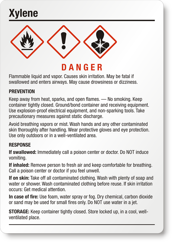 Everyone in your facility should identify Xylene containers easily. This GHS Chemical Label helps in proper identification and safe handling of hazardous chemicals.