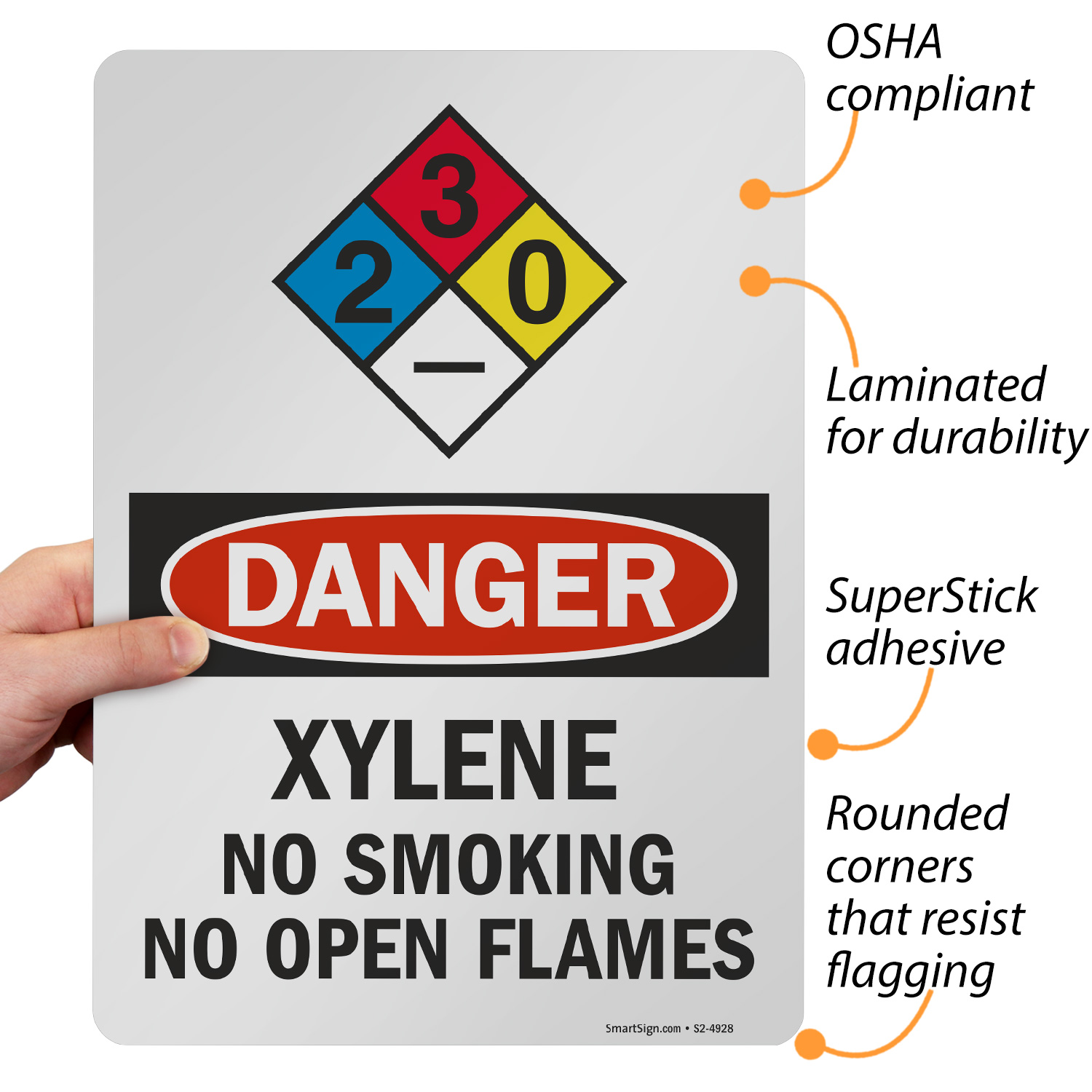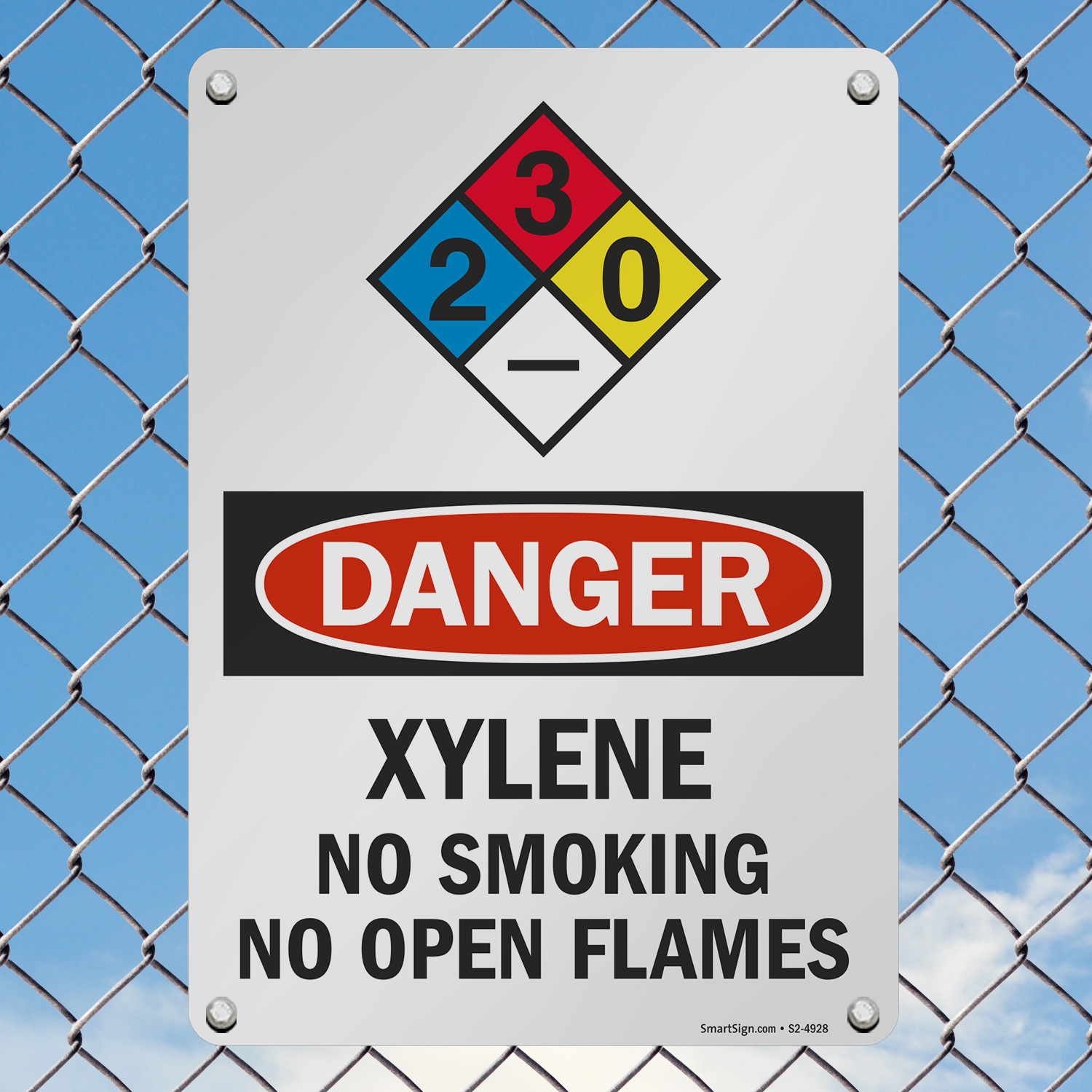 OSHA Danger Xylene sign feature the NFPA hazcom system to alert your facility of this potential risk. This sign features NFPA rating 1 for the health hazard (blue diamond), indicating there is a slight health risk.