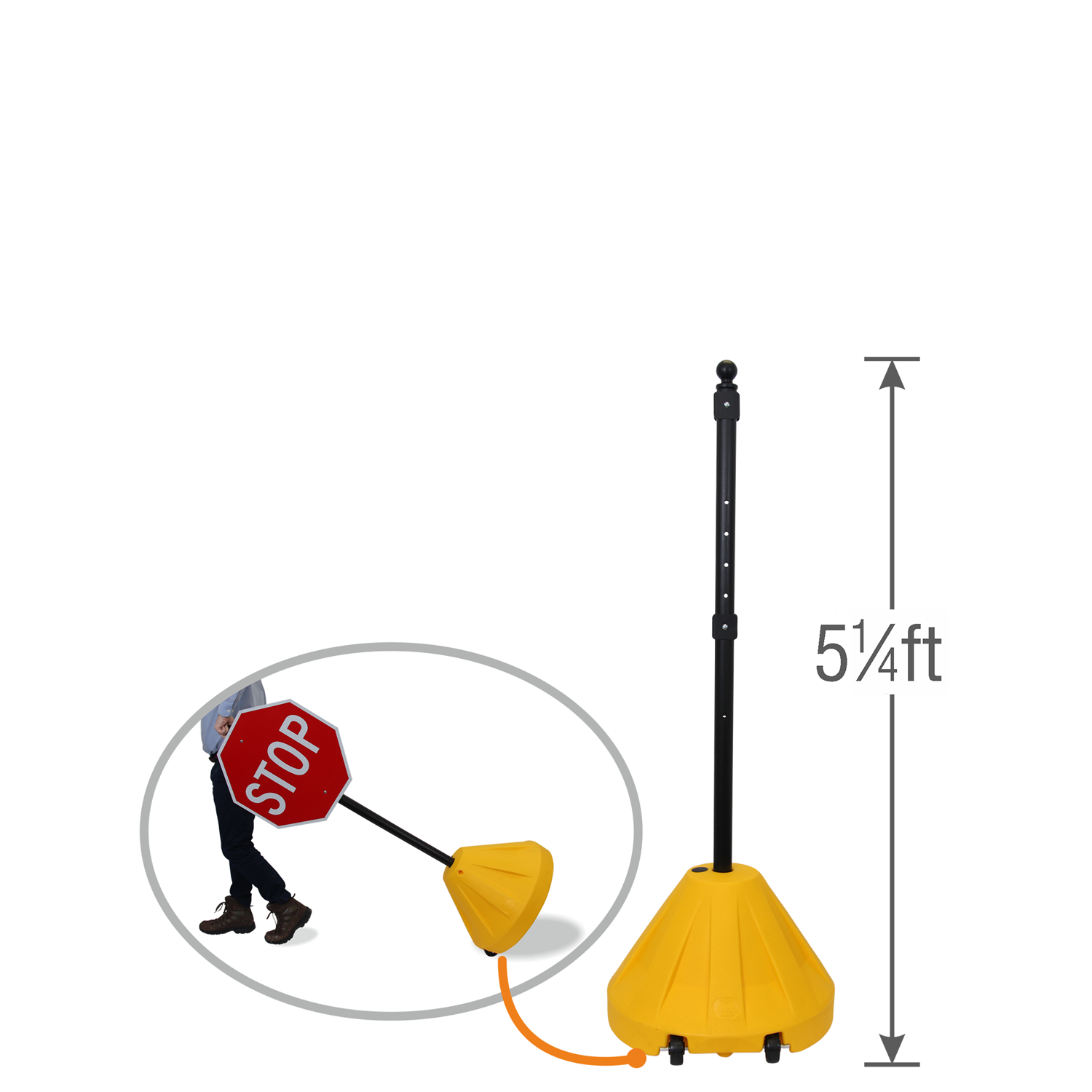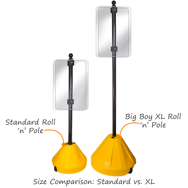 The Yellow Big Boy XL Roll 'n' Pole Portable Sign Holder can display most signs with ease. Base can be conveniently relocated to prominent areas with heavy foot traffic to increase it's effectiveness.
