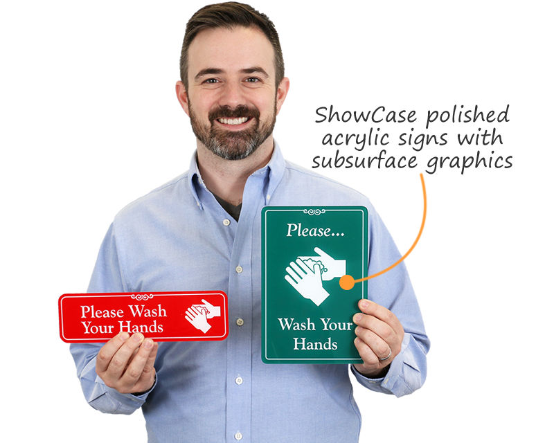 You should try our 20 mil thick and 32 mil thick DiamondPlate Aluminum Hand Washing Signs. The anodized aluminum plates feature graphics that are embedded into the pores of the aluminum. The 20 mil thick signs come with 3 mil thick, 3M adhesive (467MP) while the 32 milt thick signs come with 5 mil thick, 3M (468MP) adhesive that sticks permanently to any flat surface. Signs have up to 20 years of outdoor life and take temperatures up to 1000°F. DiamondPlate™ door signs withstand constant abuse and abrasion due to people touching the sign surface when opening or closing the door. These photo-sensitive anodized aluminum plates are great for door signs.