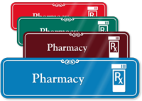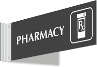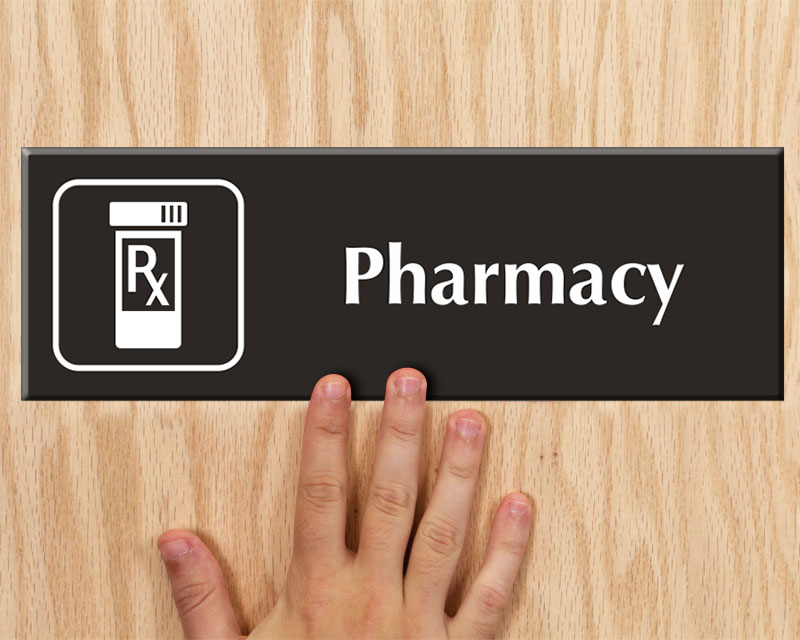 If the pharmacy is located within a larger facility, such as a hospital or clinic, use a room name sign to clearly identify its location. Our signs are printed with the word "Pharmacy" and may also include an arrow or other directional indicator to help people find their way.