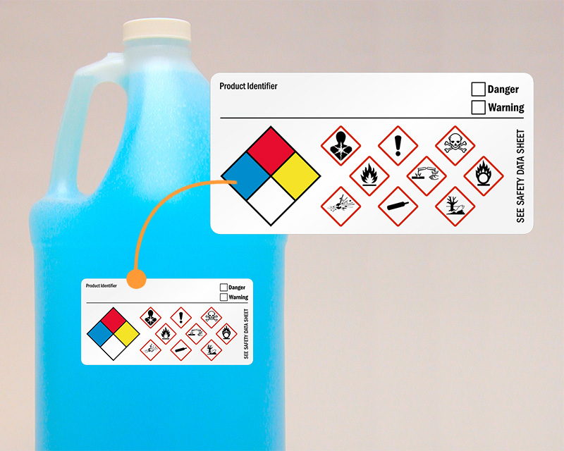 Fill out pertinent information on this GHS label to communicate accurate chemical information. Indicate the severity of the chemical hazard by choosing the appropriate header (Danger or Warning)
