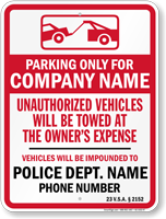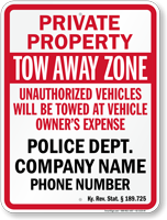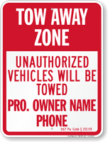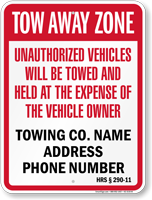 • • Find compliant tow away signs below. Local laws may vary, so we recommend you check with your local authorities before placing an order.