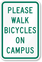 Help prevent needless bike-pedestrian accidents by posting signs in pedestrian areas which remind bikers to dismount and walk their bike.